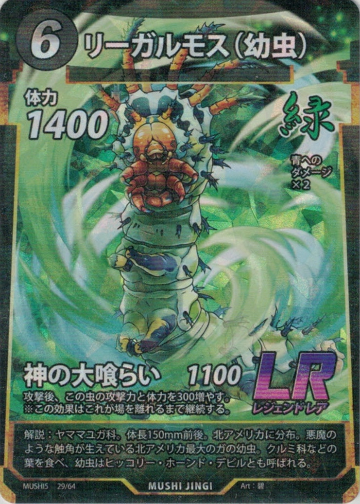 | ME-029 | リーガルモス(幼虫) | 6 | 1400 | 神の大喰らい 1100 攻撃後、この虫の攻撃力と体力を300増やす。 ※この効果はこれが場を離れるまで継続する。 |
