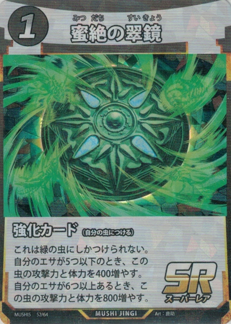 | ME-052 | 蜜絶の翠鏡 | 1 | 0 | これは緑の虫にしかつけられない。自分のエサが5つ以下のとき、この虫の攻撃力と体力を400増やす。自分のエサが6つ以上あるとき、この虫の攻撃力と体力を800増やす。 | 2枚 |