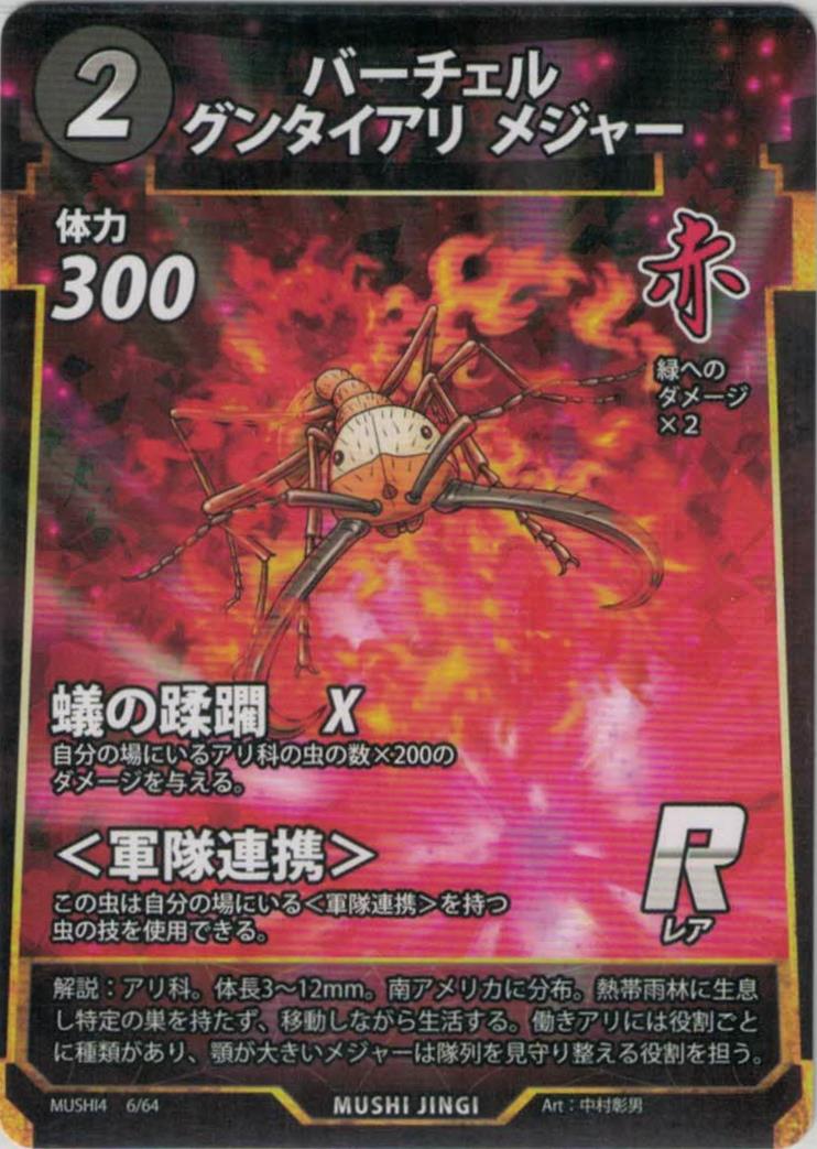 | MD-006 | バーチェルグンタイアリ メジャー | 2 | 300 | 蟻の蹂躙 X 自分の場にいるアリ科の虫の数×200のダメージを与える。 <軍隊連携> この虫は自分の場にいる<軍隊連携>を持つ虫の技を使用できる。 |