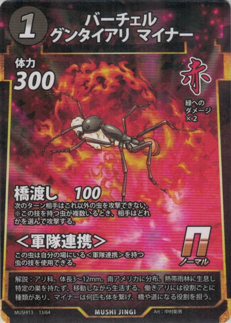 | MD-013 | バーチェルグンタイアリ マイナー | 1 | 300 | 橋渡し 100 次のターン相手はこれ以外の虫を攻撃できない。 ※この技を持つ虫が複数いるとき、相手はどれかを選んで攻撃する。 <軍隊連携> この虫は自分の場にいる<軍隊連携>を持つ虫の技を使用できる。 |