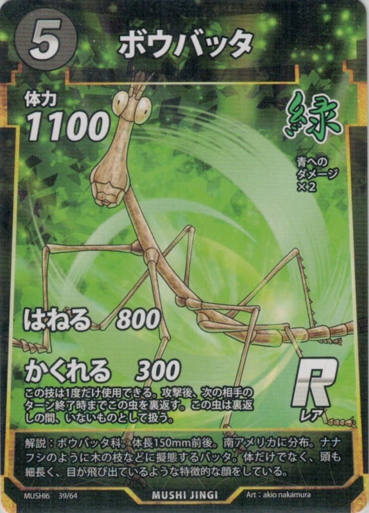 | MF-039 | ボウバッタ | 5 | 1100 | はねる 800 かくれる 300 この技は1度だけ使用できる。攻撃後、次の相手のターン終了時までこの虫を裏返す。この虫は裏返しの間、いないものとして扱う。 |