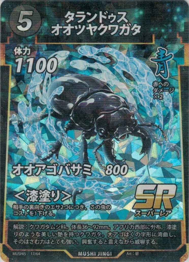 ME-017 | タランドゥス オオツヤクワガタ | 5 | 1100 | オオアゴバサミ 800 <漆塗り> 相手の裏向きのエサ2つにつき、この虫のコストを1下げる。 |