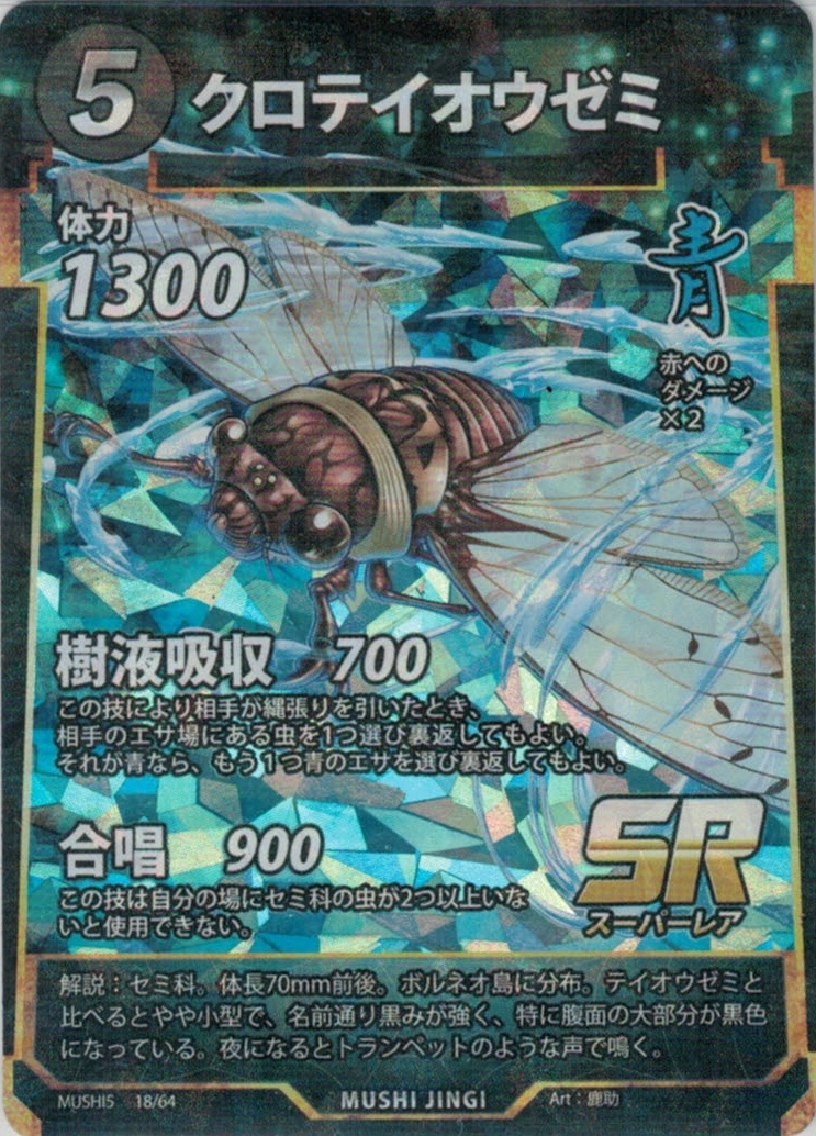 ME-018 | クロテイオウゼミ | 5 | 1300 | 樹液吸収 700 この技により相手か縄張りを引いたとき、相手のエサ場にある虫を1つ選び裏返してもよい。それが青なら、もう1つ青のエサを選び裏返してもよい。 合唱 900 この技は自分の場にセミ科の虫が2つ以上いないと使用できない。 |