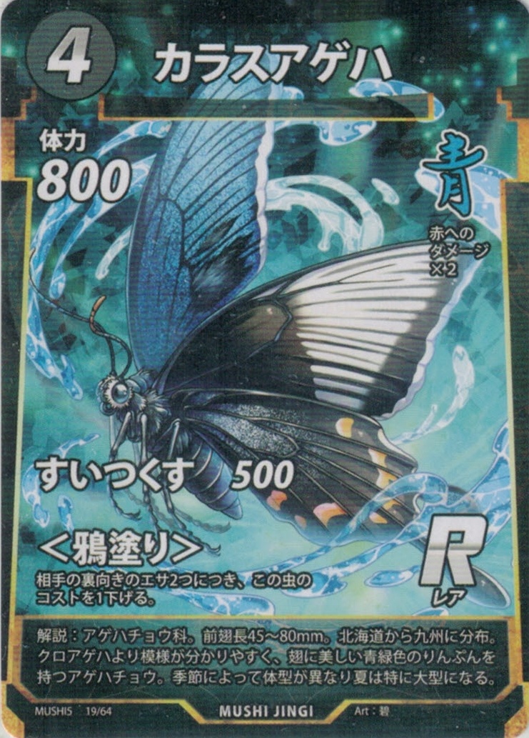 ME-019 | カラスアゲハ | 4 | 800 | すいつくす 500 <鴉塗り> 相手の裏向きのエサ2つにつき、この虫のコストを1下げる。 |