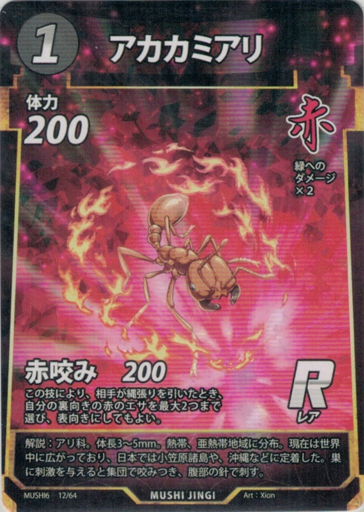MF-012 | アカカミアリ | 1 | 200 | 赤咬み 200 この技により、相手が縄張りを引いたとき、自分の裏向きの赤のエサを最大2つまで選び、表向きにしてもよい。 |