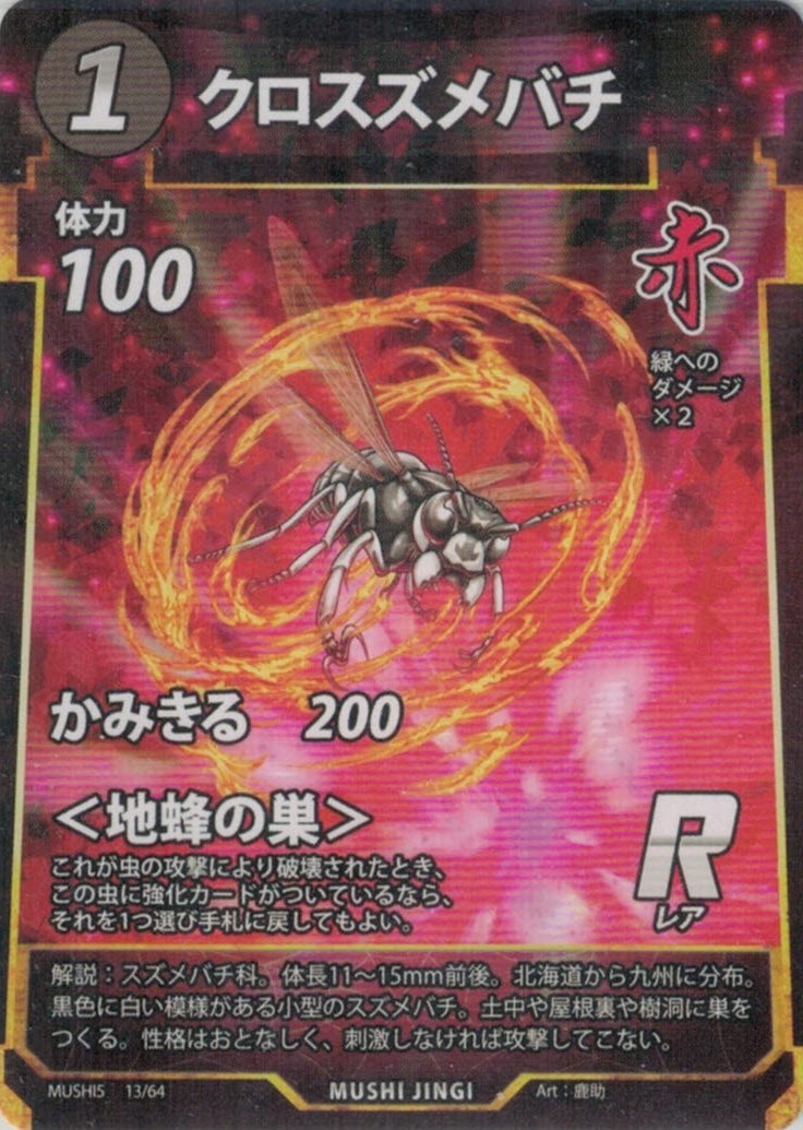 | ME-013 | クロスズメバチ | 1 | 100 | かみきる 200 <地蜂の巣> これが虫の攻撃により破壊されたとき、この虫に強化カードがついているなら、それを1つ選び手札に戻してもよい。 |