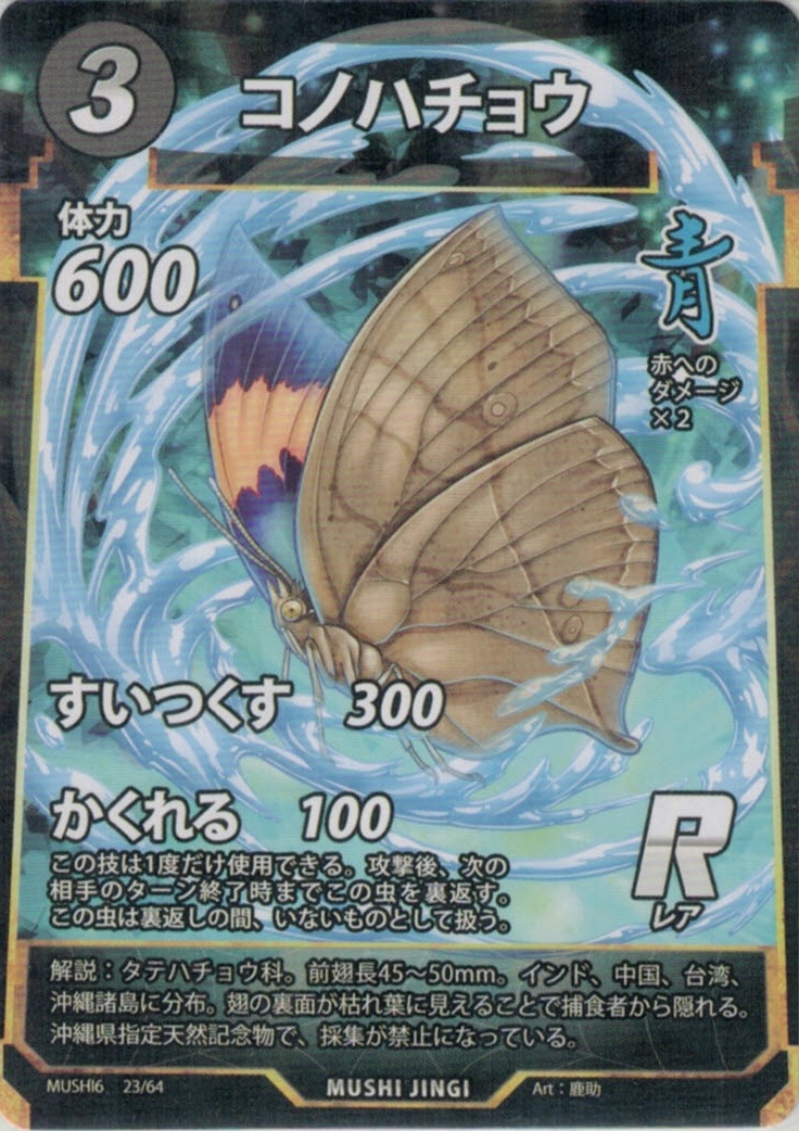 | MF-023 | コノハチョウ | 3 | 600 | すいつくす 300 かくれる 100 この技は1度だけ使用できる。攻撃後、次の相手のターン終了時までこの虫を裏返す。この虫は裏返しの間、いないものとして扱う。 |