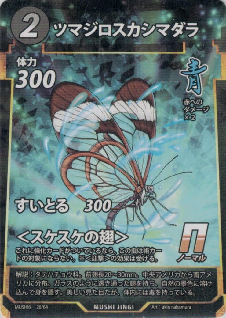 | MF-026 | ツマジロスカシマダラ | 2 | 300 | すいとる 300 <スケスケの翅> これに強化カードがついているなら、この虫は術カードの対象にならない。 ※<迎撃>の効果は受ける。 |