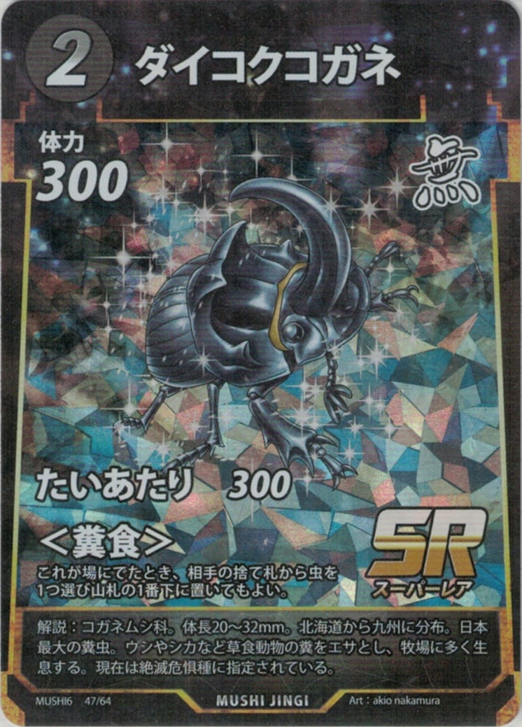 | MF-047 | ダイコクコガネ | 2 | 300 | たいあたり 300 <糞食> これが場にでたとき、相手の捨て札から虫を1つ選び山札の1番下に置いてもよい。 |