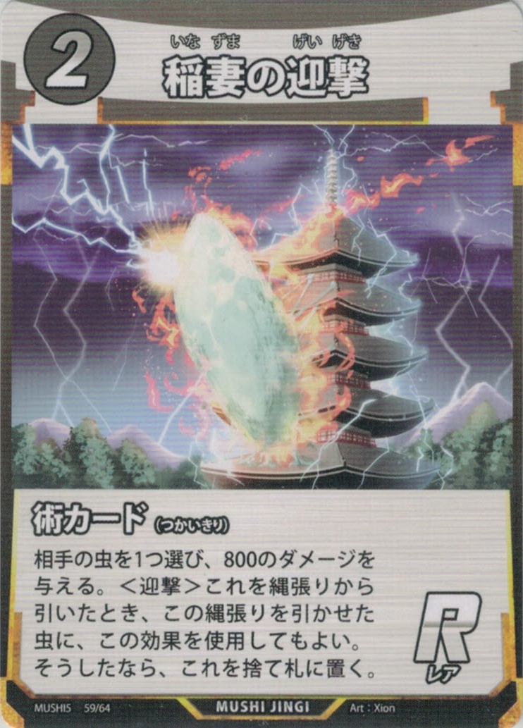 | ME-059 | 稲妻の迎撃 | 2 | 0 | 相手の虫を1つ選び、800のダメージを与える。 <迎撃> これを縄張りから引いたとき、この縄張りを引かせた虫に、この効果を使用してもよい。そうしたなら、これを捨て札に置く。 |