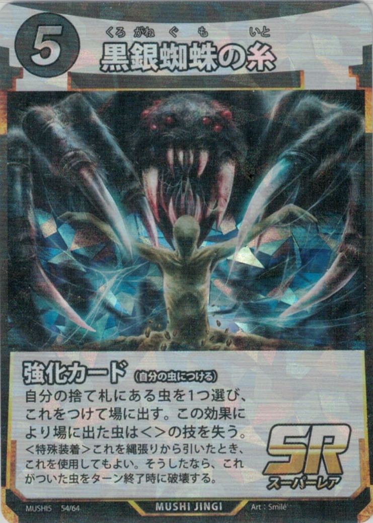 | ME-054 | 黒銀蜘蛛の糸 | 5 | 0 | 自分の捨て札にある虫を1つ選び、これをつけて場に出す。この効果により場に出た虫は<>の技を失う。 <特殊装着> これを縄張りから引いたとき、これを使用してもよい。そうしたなら、これがついた虫をターン終了時に破壊する。 |