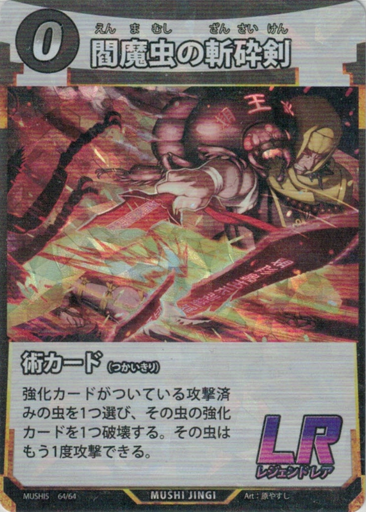 | ME-064 | 閻魔虫の斬砕剣 | 0 | 0 | 強化カードがついている攻撃済みの虫を1つ選び、その虫の強化カードを1つ破壊する。その虫はもう1度攻撃できる。 | 2枚 |