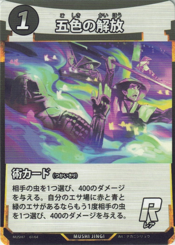 | MG-061 | 五色の解放 | 1 | 0 | 相手の虫を1つ選び、400のダメージ を与える。自分のエサ場に赤と青と 緑のエサがあるならもう1度相手の虫を1つ選び、400のダメージを与える。 | 1枚 |