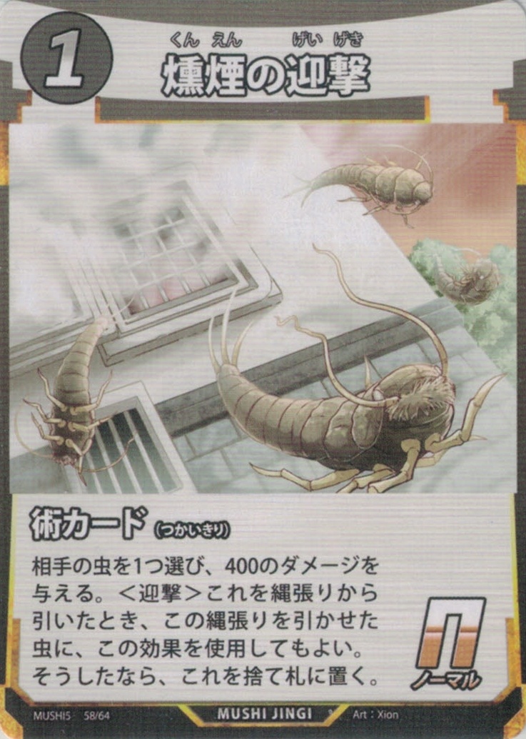 | ME-058 | 燻煙の迎撃 | 1 | 0 | 相手の虫を1つ選び、400のダメージを与える。 <迎撃> これを縄張りから引いたとき、この縄張りを引かせた虫に、この効果を使用してもよい。そうしたなら、これを捨て札に置く。 |